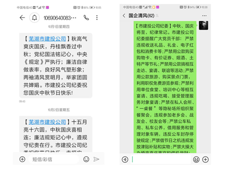 發(fā)送廉政短信。中秋國慶前期和期間,公司紀委向全體干部員工及控股企業(yè)領(lǐng)導(dǎo)班子成員累計發(fā)送廉政短信348條次,通過企業(yè)微信群累計發(fā)送廉政提醒14次,在表達節(jié)日祝福的同時,提醒廣大領(lǐng)導(dǎo)干部嚴格遵守廉潔自律各項規(guī)定,繃緊廉潔自律這根弦,筑牢拒腐防變這道防線。