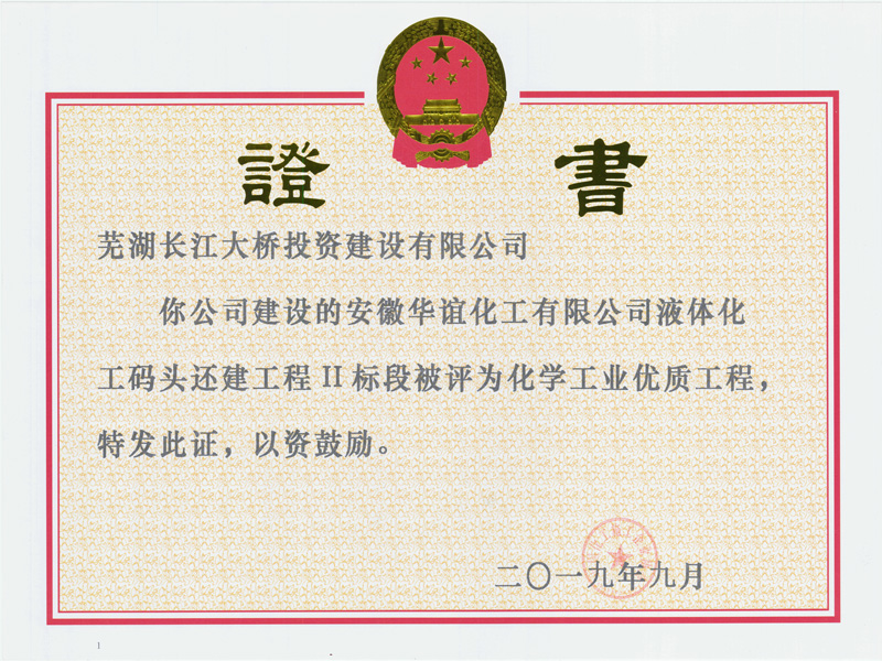 日前,由我公司建設(shè)的安徽華誼化工有限公司液體化工碼頭還建工程Ⅱ標(biāo)段項(xiàng)目,被中國(guó)化工企業(yè)施工協(xié)會(huì)評(píng)為化學(xué)工業(yè)優(yōu)質(zhì)工程。